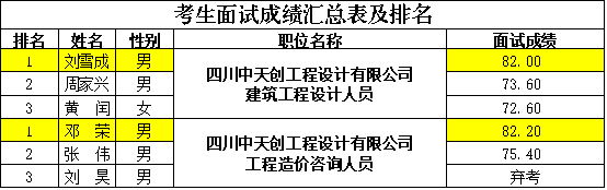 根据《四川中天创工程设计有限公司关于招聘人员的公告》相关规定,2026年1月17日已完成四川中天创工程设计有限公司面试考核工作,现将公开招聘人员面试成绩及排名予以公示如下:
